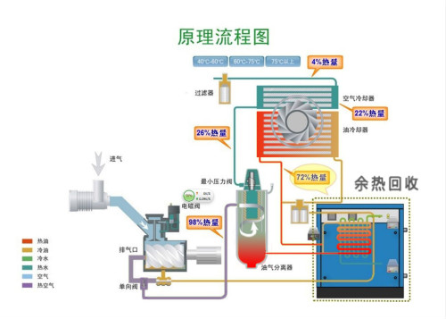 在以上過程中,高溫高壓的油、氣所攜帶的熱量大致相當于空氣壓縮機功率的3/4其溫度通常在80℃—100℃之間。螺桿式空氣壓縮機通過其自身的散熱系統來給高 溫高壓的油、氣降溫的過程中,大量的熱能_被無端的浪費了。